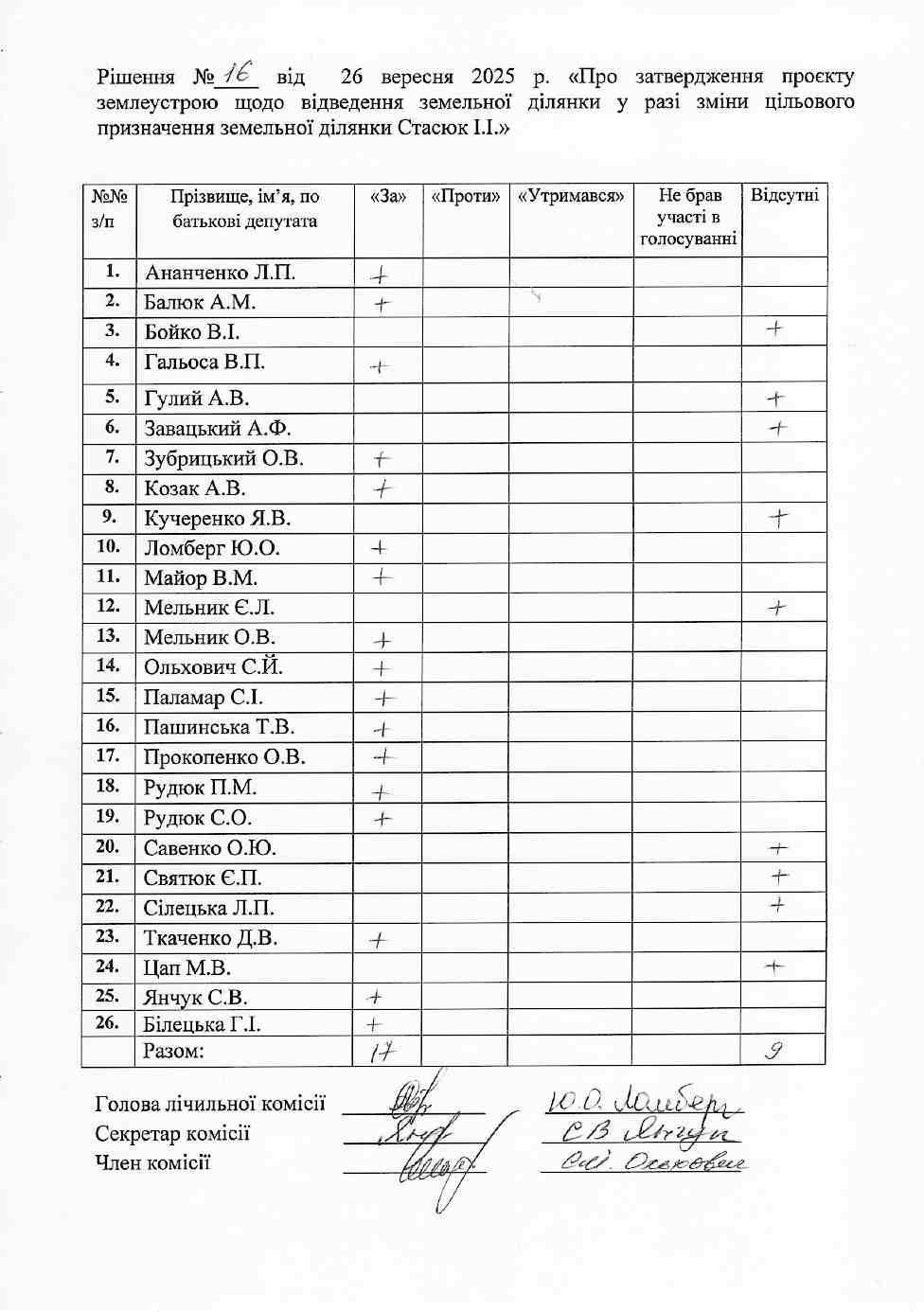 Рішення №16 від 26.09.2025 р. Про затвердження проєкту землеустрою щодо відведення земельної ділянки у разі зміни цільового призначення земельної ділянки Стасюк І.І.