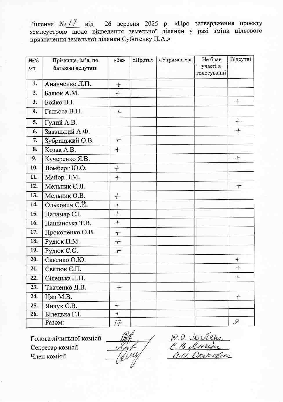 Рішення №17 від 26.09.2025 р. Про затвердження проєкту землеустрою щодо відведення земельної ділянки у разі зміни цільового призначення земельної ділянки Суботенку П.А.