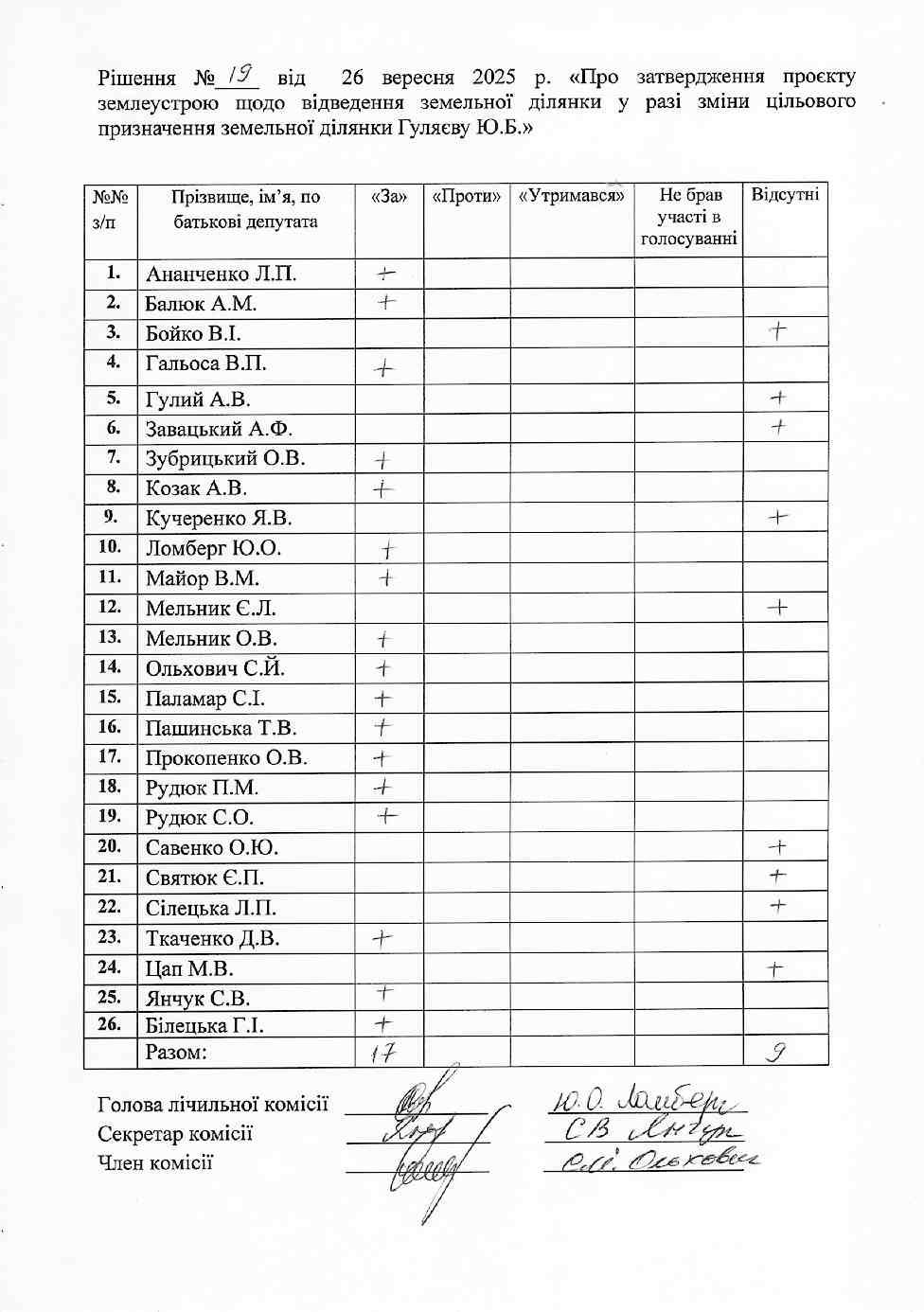 Рішення №19 від 26.09.2025 р. Про затвердження проєкту землеустрою щодо відведення земельної ділянки у разі зміни цільового призначення земельної ділянки Гуляєву Ю.Б.
