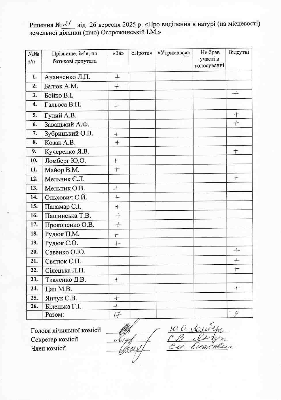 Рішення №21 від 26.09.2025 р. Про виділення в натурі (на місцевості) земельної ділянки (паю) Острожинській І.М.