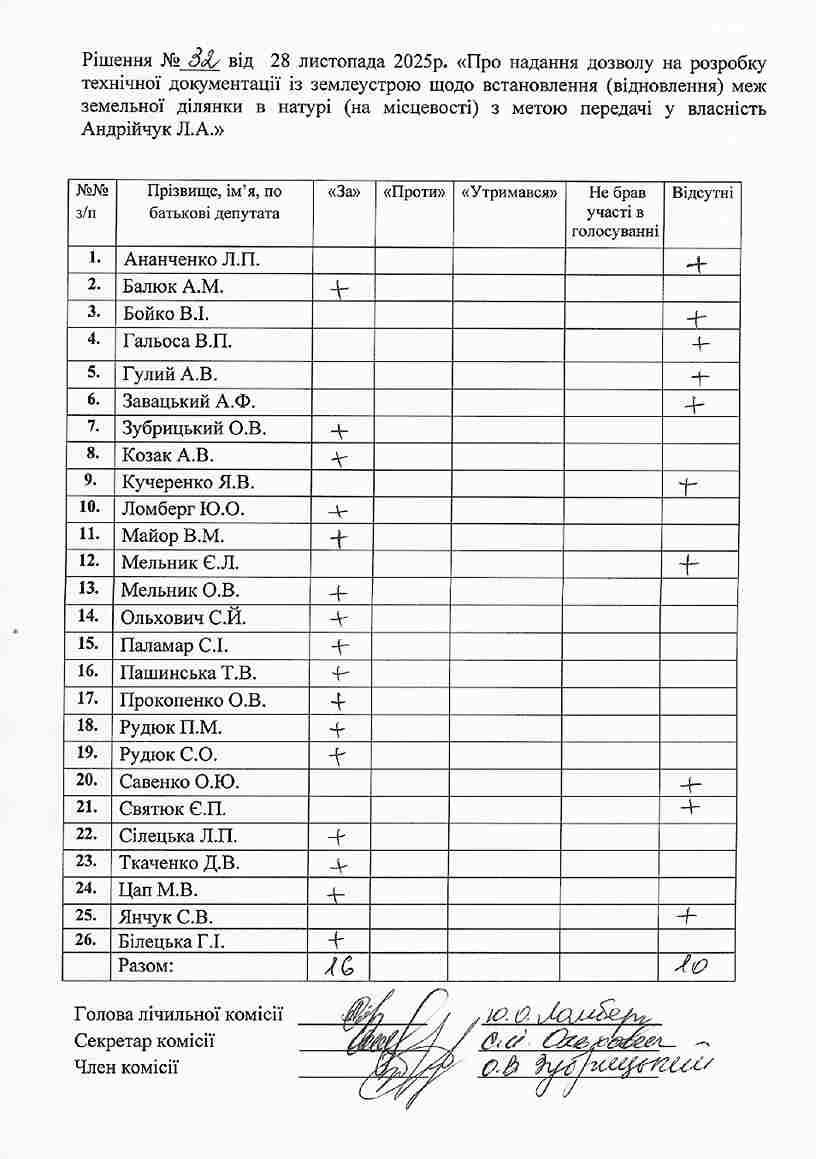 Рішення №32 від 28.11.2025 р. Про надання дозволу на розробку технічної документації із землеустрою щодо встановлення (відновлення) меж земельної ділянки в натурі (на місцевості) з метою передачі у власність Андрійчук Л.А.