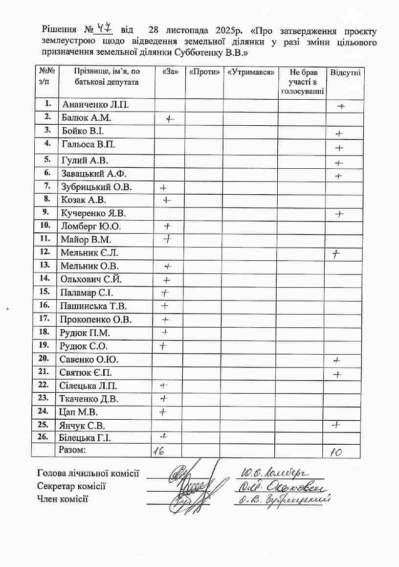 Рішення №47 від 28.11.2025 р. Про затвердження проєкту землеустрою щодо відведення земельної ділянки у разі зміни цільового призначення земельної ділянки Субботенку В.В.