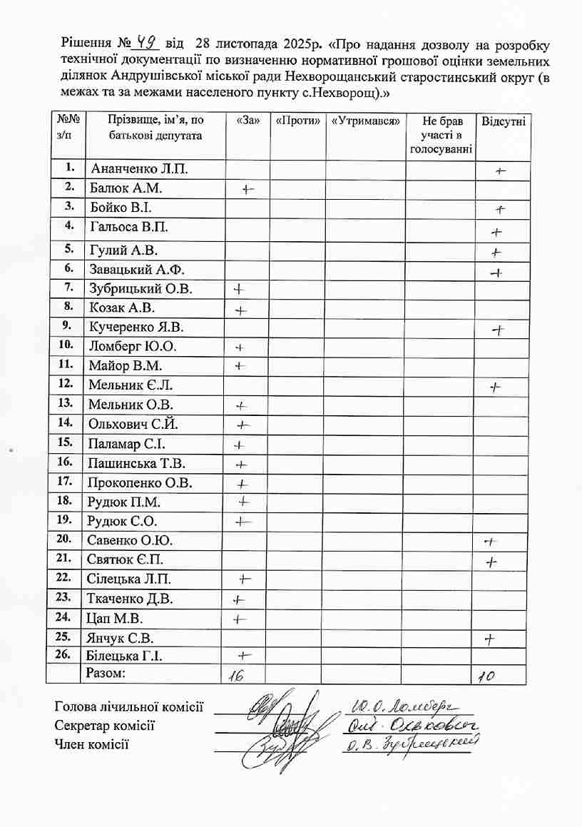 Рішення №49 від 28.11.2025 р. Про надання дозволу на розробку технічної документації по визначенню нормативної грошової оцінки земельних ділянок Андрушівської міської ради Нехворощанський старостинський округ (в межах та за межами населеного пункту с.Нехворощ)