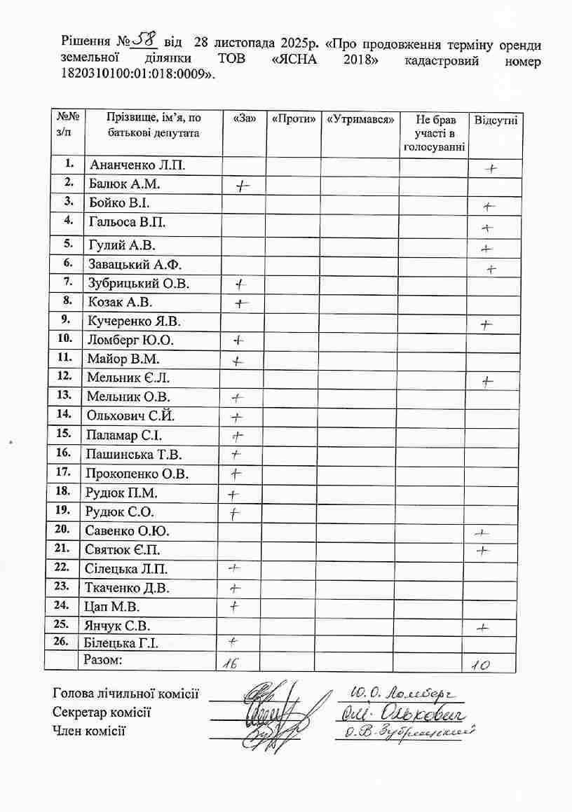 Рішення №58 від 28.11.2025 р. Про продовження терміну оренди земельної ділянки ТОВ «ЯСНА 2018» кадастровий номер 1820310100:01:018:0026