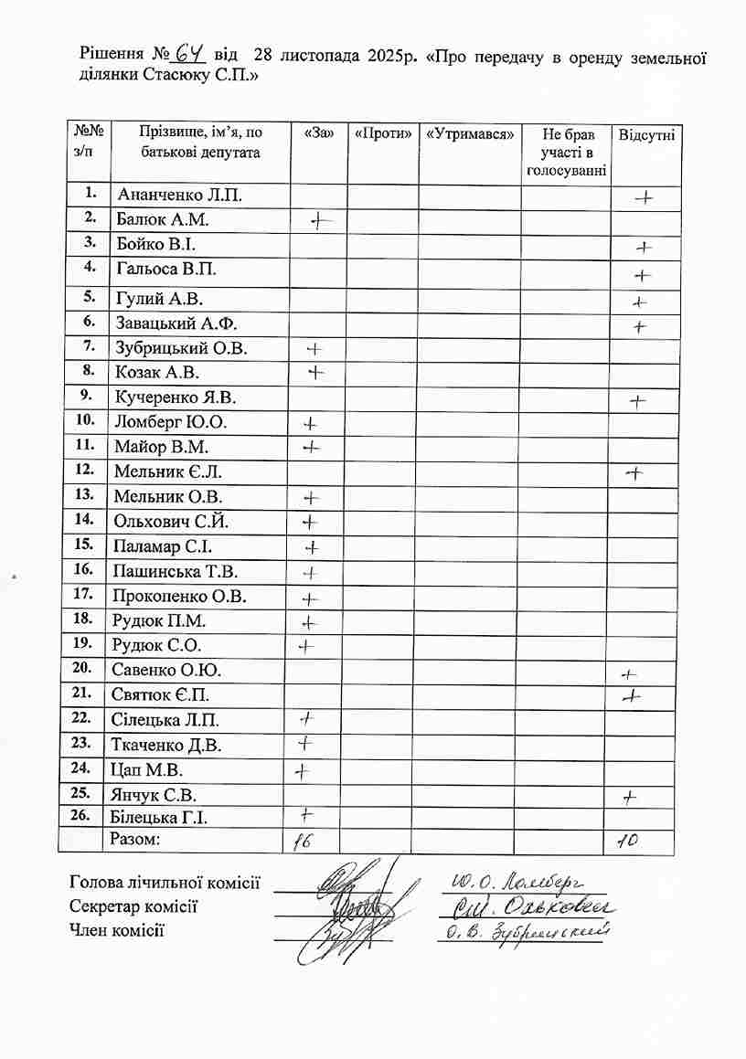 Рішення №64 від 28.11.2025 р. Про передачу в оренду земельної ділянки Стасюку С.П.