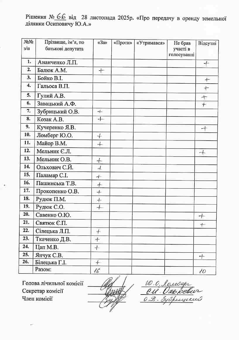 Рішення №66 від 28.11.2025 р. Про передачу в оренду земельної ділянки Осиповичу Ю.А.
