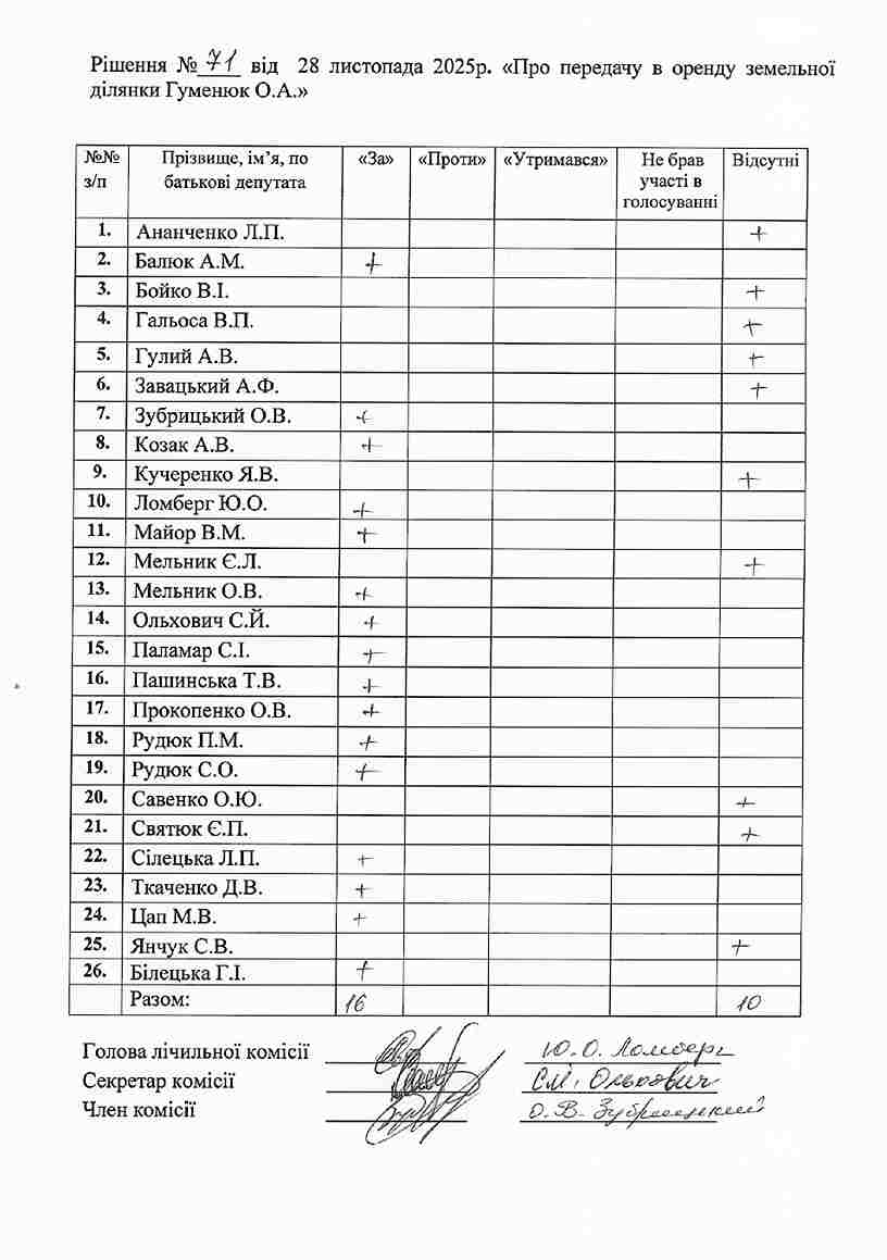 Рішення №71 від 28.11.2025 р. Про передачу в оренду земельної ділянки Гуменюк О.А.
