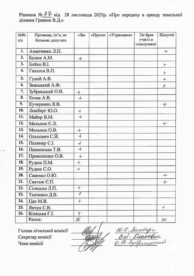 Рішення №77 від 28.11.2025 р. Про передачу в оренду земельної ділянки Гринюк В.Д.