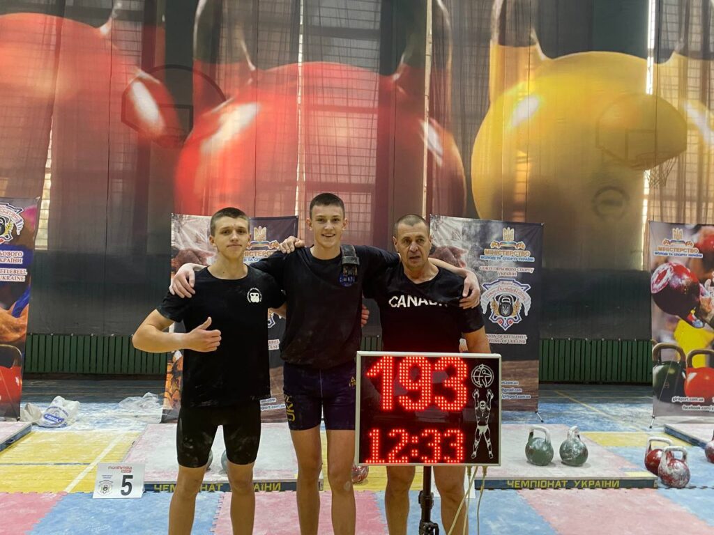 Кравченко Олександр ривок гирі з довільною зміною рук, вага гирі 32 кг, 156 підйомів – 4 місце.
