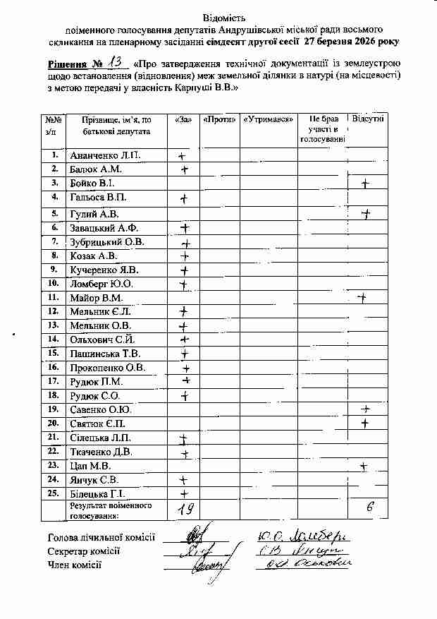 Рішення №13 від 27.03.2026 р. Про затвердження технічної документації із землеустрою щодо встановлення (відновлення) меж земельної ділянки в натурі (на місцевості) з метою передачі у власність Карпуші В.В.