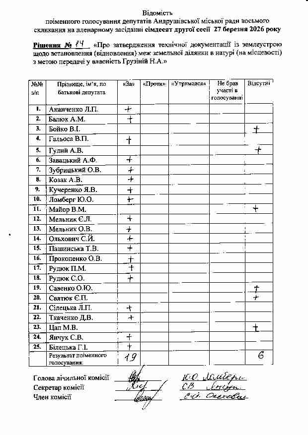Рішення №14 від 27.03.2026 р. Про затвердження технічної документації із землеустрою щодо встановлення (відновлення) меж земельної ділянки в натурі (на місцевості) з метою передачі у власність Грузіній Н.А.