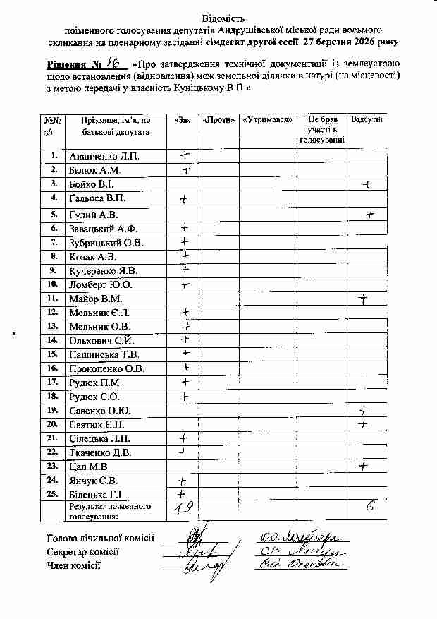 Рішення №16 від 27.03.2026 р. Про затвердження технічної документації із землеустрою щодо встановлення (відновлення) меж земельної ділянки в натурі (на місцевості) з метою передачі у власність Куніцькому В.П.