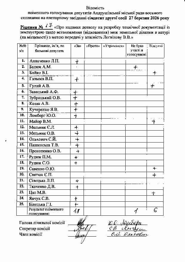 Рішення №17 від 27.03.2026 р. Про надання дозволу на розробку технічної документації із землеустрою щодо встановлення (відновлення) меж земельної ділянки в натурі (на місцевості) з метою передачі у власність Логвінову В.В.