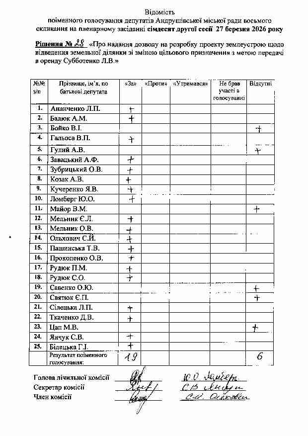 Рішення №28 від 27.03.2026 р. Про надання дозволу на розробку проекту землеустрою щодо відведення земельної ділянки зі зміною цільового призначення з метою передачі в оренду Субботенко Л.В.