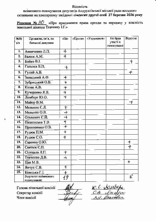 Рішення №30 від 27.03.2026 р. Про припинення права оренди та передачу у власність земельної ділянки Ткаченку І.Г.