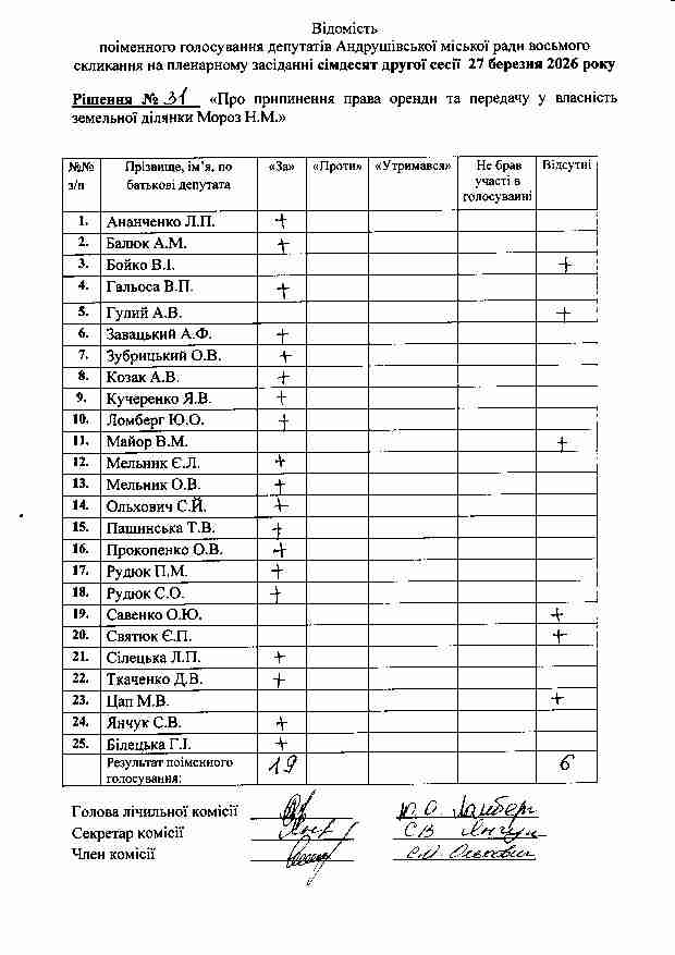 Рішення №31 від 27.03.2026 р. Про припинення права оренди та передачу у власність земельної ділянки Мороз Н.М.