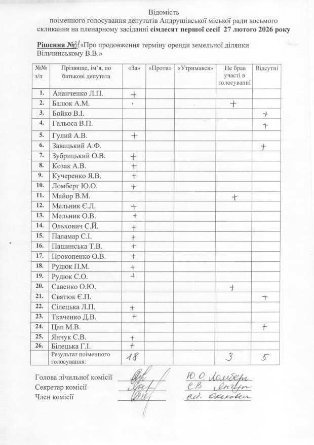 Рішення №31 від 27.02.2026 р. Про продовження терміну оренди земельної ділянки Вільчинському В.В.