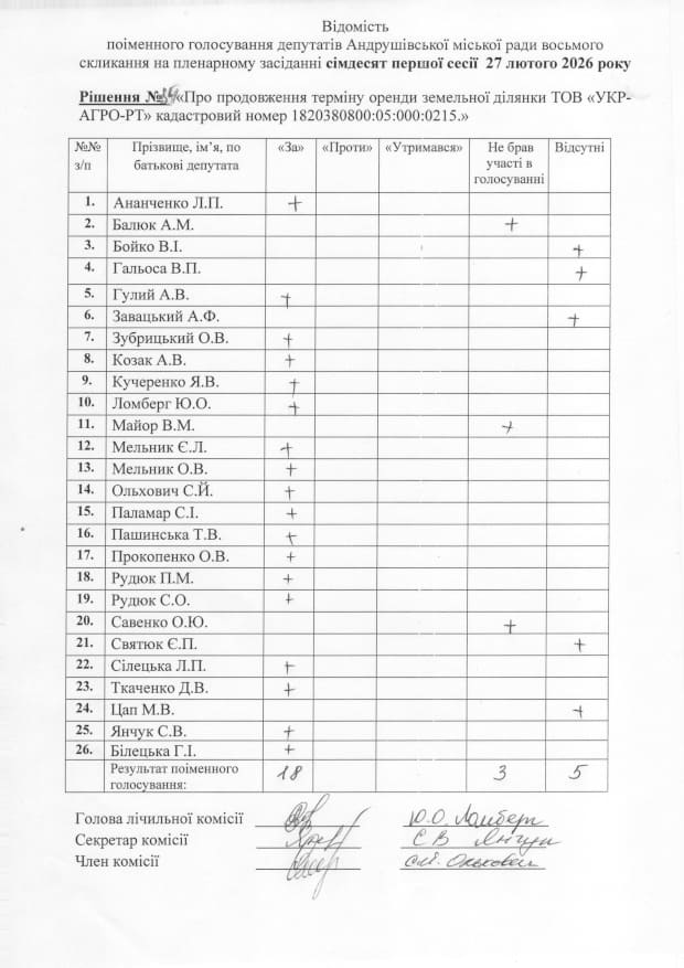 Рішення №34 від 27.02.2026 р. Про продовження терміну оренди земельної ділянки ТОВ «УКР-АГРО-РТ» кадастровий номер 1820380800:05:000:0215