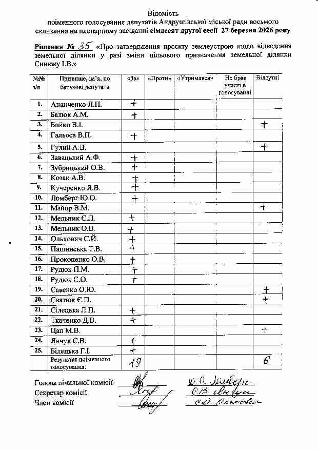 Рішення №35 від 27.03.2026 р. Про затвердження проєкту землеустрою щодо відведення земельної ділянки у разі зміни цільового призначення земельної ділянки Синюку І.В.