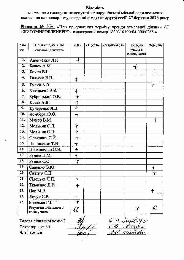 Рішення №37 від 27.03.2026 р. Про продовження терміну оренди земельної ділянки АТ «ЖИТОМИРОБЛЕНЕРГО» кадастровий номер 1820310100:04:000:0268