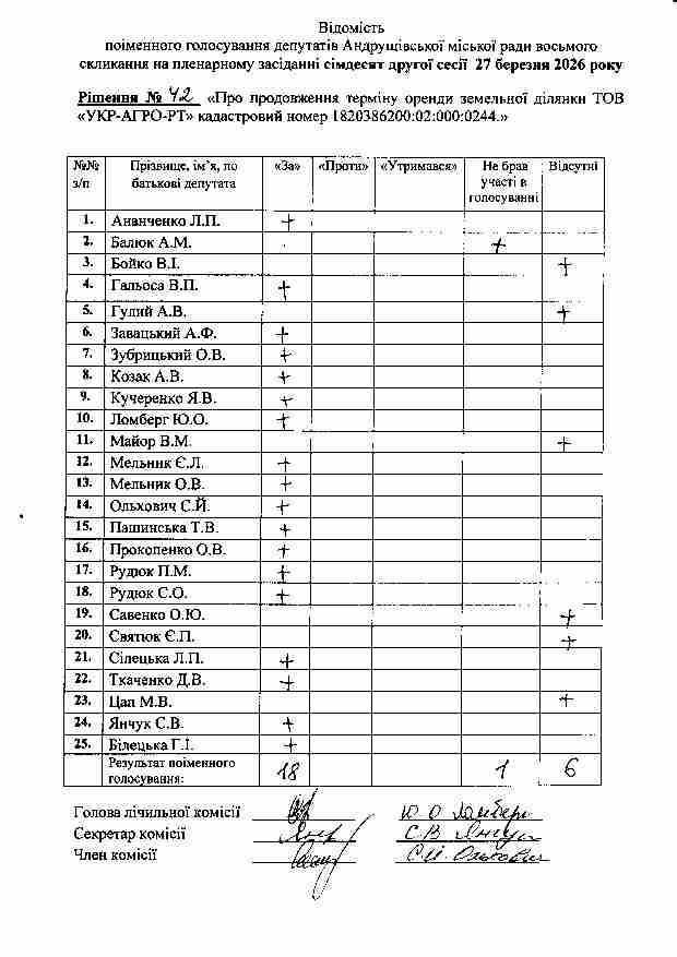 Рішення №42 від 27.03.2026 р. Про продовження терміну оренди земельної ділянки ТОВ «УКР-АГРО-РТ» кадастровий номер 1820386200:02:000:0244