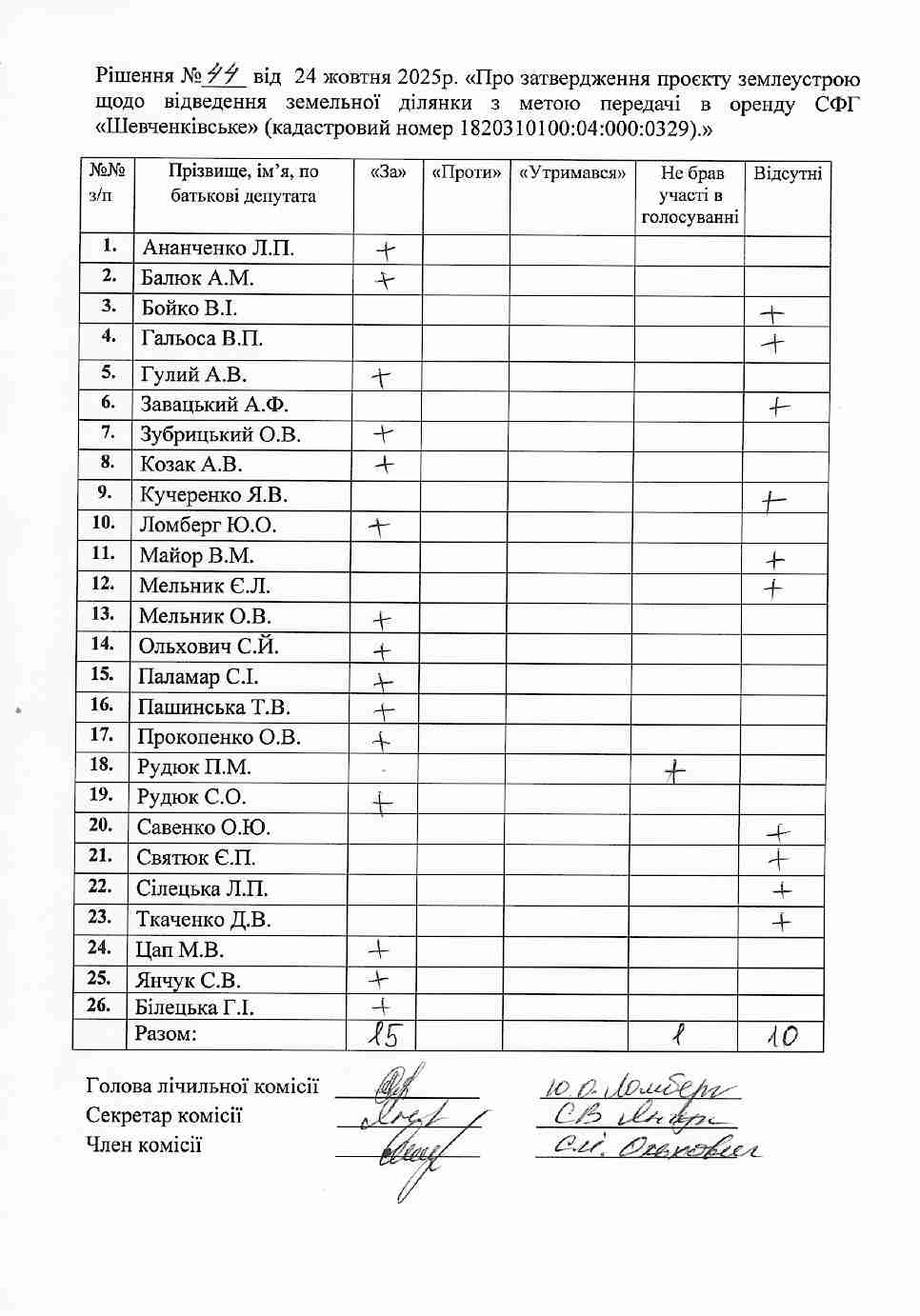 Рішення №44 від 24.10.2025 р. Про затвердження проєкту землеустрою щодо відведення земельної ділянки з метою передачі в оренду СФГ «Шевченківське» (кадастровий номер 1820310100:04:000:0329)