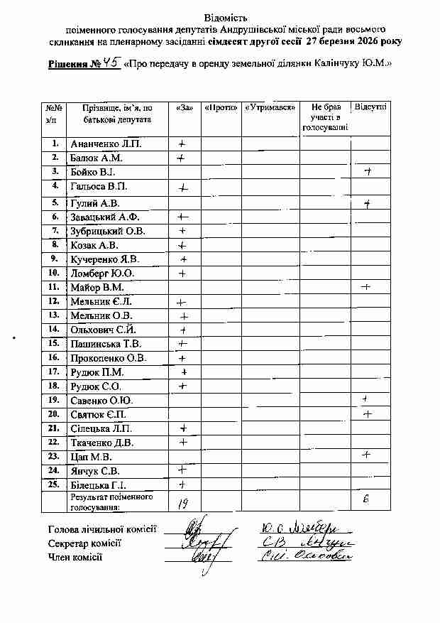 Рішення №45 від 27.03.2026 р. Про передачу в оренду земельної ділянки Калінчуку Ю.М.