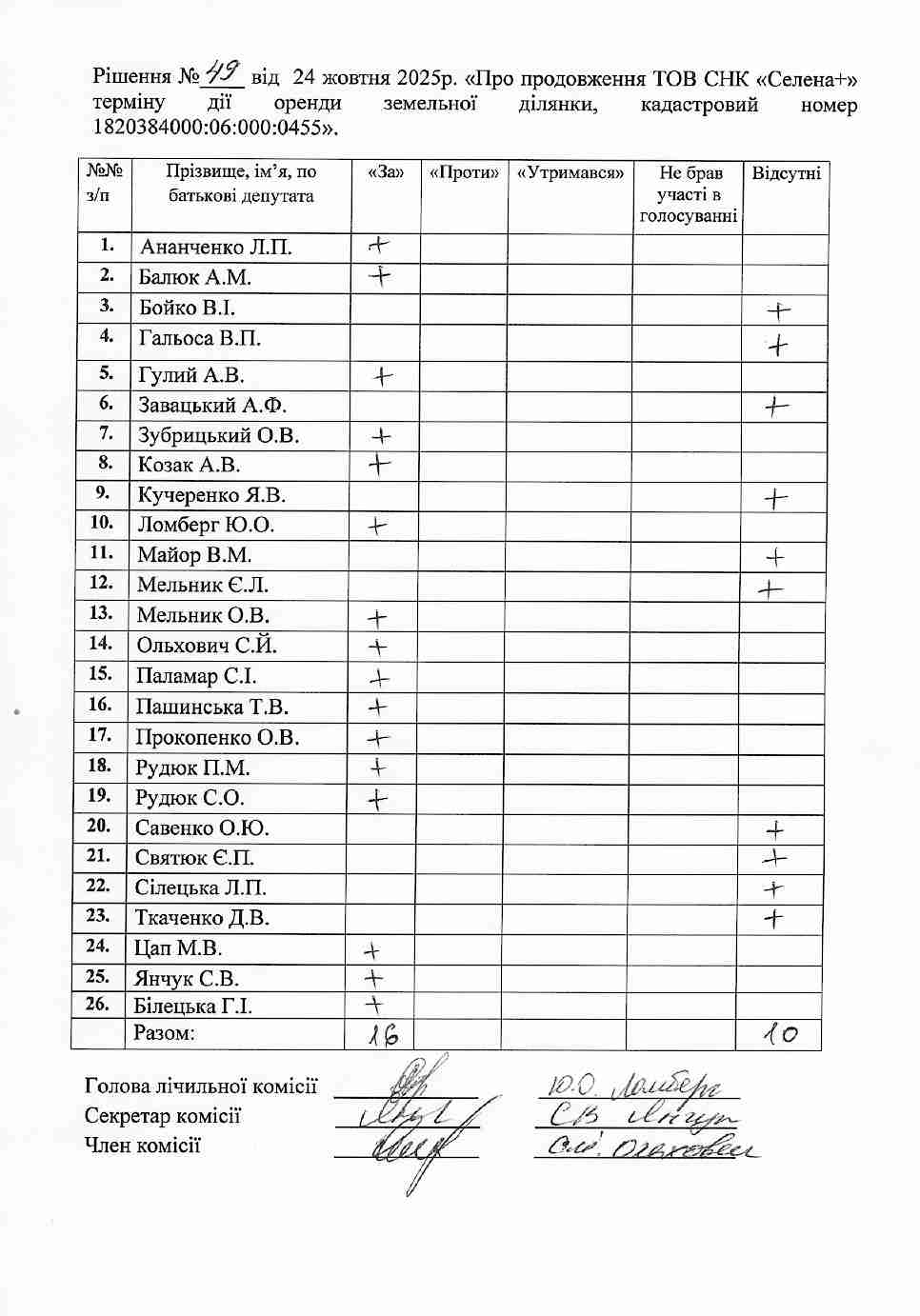 Рішення №49 від 24.10.2025 р. Про продовження ТОВ СНК «Селена+» терміну дії оренди земельної ділянки, кадастровий номер 1820384000:06:000:0455