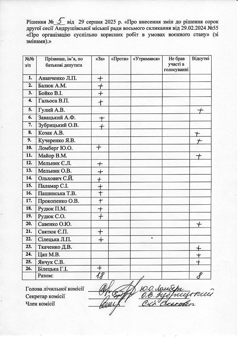 Рішення №5 від 29.08.2025 р. Про внесення змін до рішення сорок другої сесії Андрушівської міської ради восьмого скликання від 29.02.2024 №55 «Про організацію суспільно корисних робіт в умовах воєнного стану» (зі змінами).