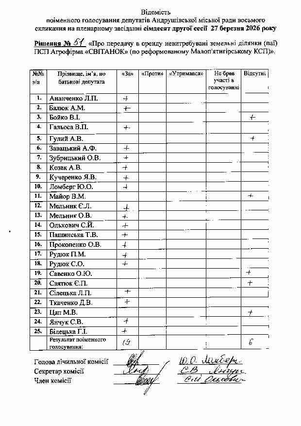 Рішення №51 від 27.03.2026 р. Про передачу в оренду невитребувані земельні ділянки (паї) ПСП Агрофірма «СВІТАНОК» (по реформованому Малоп’ятигірському КСП)