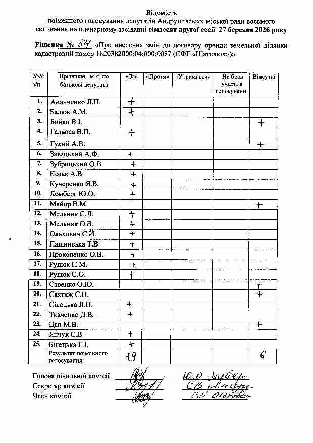 Рішення №54 від 27.03.2026 р. Про внесення змін до договору оренди земельної ділянки кадастровий номер 1820382000:04:000:0087 (СФГ «Шателюк»)