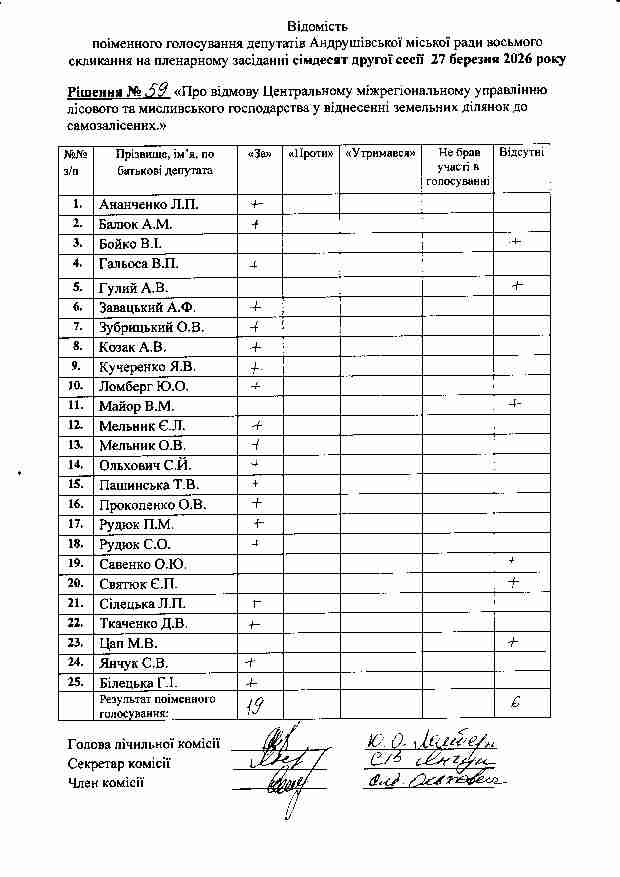 Рішення №59 від 27.03.2026 р. Про відмову Центральному міжрегіональному управлінню лісового та мисливського господарства у віднесенні земельних ділянок до самозалісених