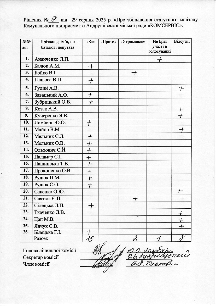 Рішення №9 від 29.08.2025 р. Про збільшення статутного капіталу Комунального підприємства Андрушівської міської ради «КОМСЕРВІС»